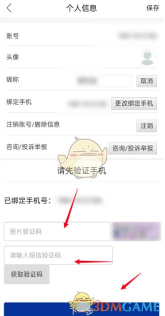 3、进入到新界面后,输入图片验证码获取并输入手机验证码,点击下一步按钮。