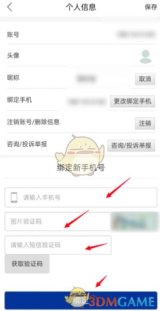 4、进入到新界面后,输入新手机号,获取并输入验证码,点击绑定按钮,即为更改完毕。