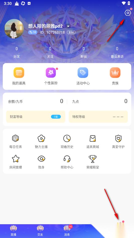 1.当我们将手机上的九秀直播app点击打开之后,选择我的页面上方的设置图标点击打开。