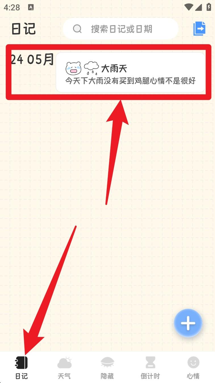 5. 回到首页即可看到刚写完的日记条目,包含标题、内容、天气与心情表情,一眼就能回顾当天状态。