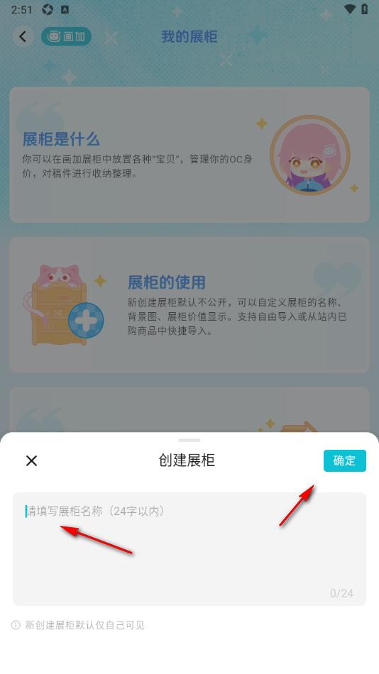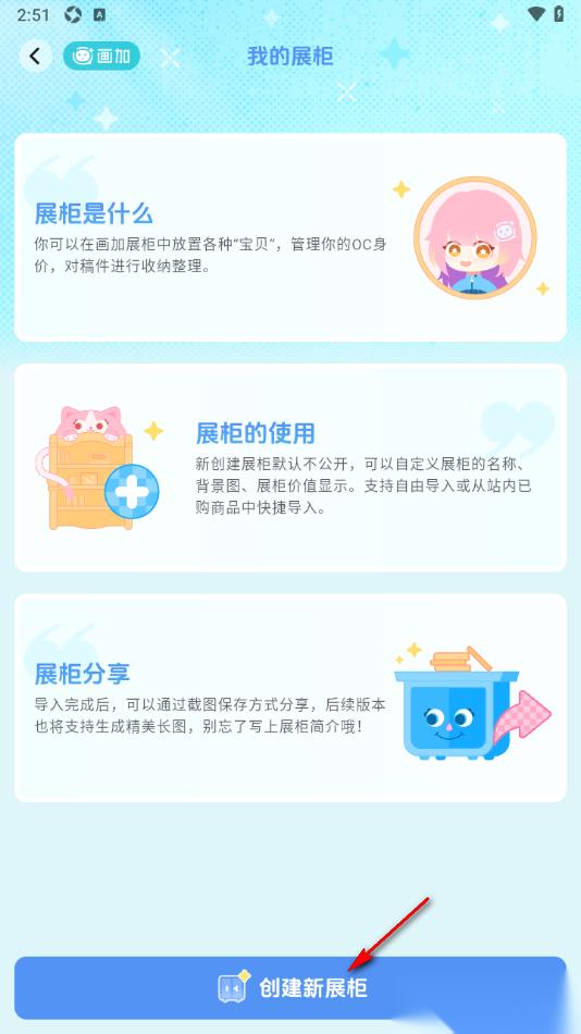 在使用画加app这款软件的过程中,可以创建一个展柜,用于放置一些自己比较感兴趣的内容,以及管理自己的作品等,还可以将自己的稿件内容通过该软件整理和收纳等,直接参考上述的步骤教程即可创建展柜,还能为该展柜设置一个自己喜欢的名字,感兴趣的用户可以来操作试试。