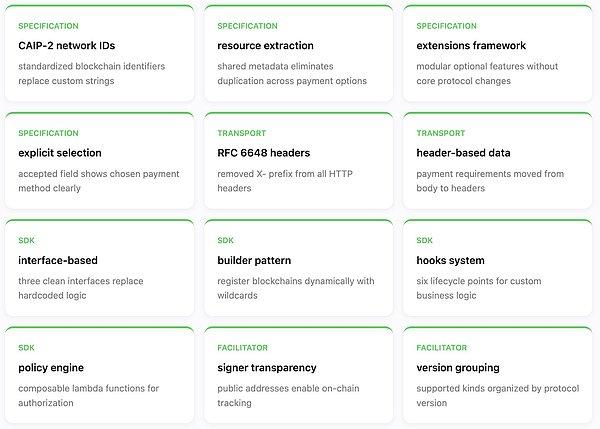x402 协议v2版本基于生产部署经验,代表着一次根本性的架构变革(有兴趣可以自行到 x402 的基金会观看: 1 亿笔交易后,团队识别出了关键的摩擦点,并围绕三个目标重新设计了协议:清晰的层级分离、与区块链无关的可扩展性以及符合 Web 标准。