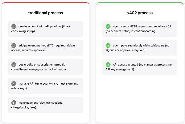 传统的支付流程需要多个手动步骤和人工干预。x402 通过实现自主、即时支付来消除了摩擦。
