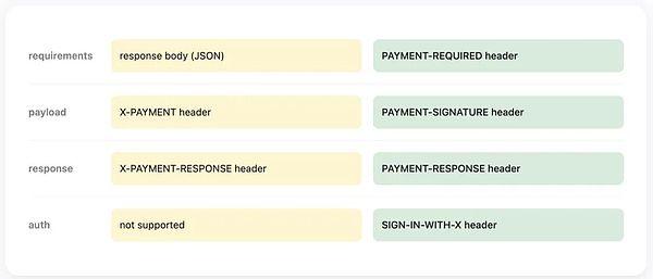 IETF 弃用了 HTTP 标头的 “X-” 前缀,因为实验性标头往往会成为事实上的标准,但却始终被标记为实验性。v2版本移除了这些前缀,并将支付要求从响应体移至标头。为什么要移至标头?将协议元数据与应用程序内容分离,使得服务器能够为浏览器返回自定义 HTML 付费墙,同时在标头中保持机器可读的支付要求。这提高了中间件兼容性和框架集成性。