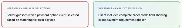 v1版本使用字段匹配启发式方法来确定客户端选择了哪个支付选项。v2版本通过一个包含完整所选支付要求的 “accepted” 字段,使选择过程更加明确。