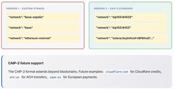 v1版本使用了自定义网络标识符,例如 “base-sepolia” 和 “base”。v2版本采用了 CAIP-2(链无关改进提案 2),格式为 "namespace:reference"。这使得它能够支持任何区块链,甚至非区块链支付系统。