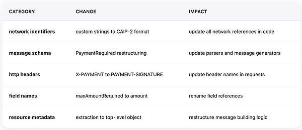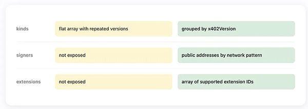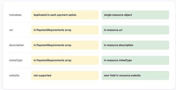 v1版本在每个支付选项中都重复了资源元数据。如果服务器接受了三种代币,它会重复三次 URL、描述和内容类型。v2版本将其提取到一个共享资源对象中,从而减小了消息大小并消除了不一致性。