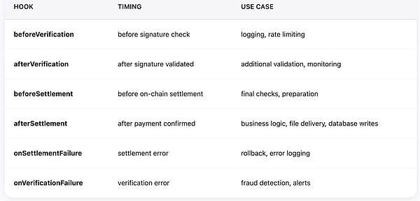 v1版本在验证之后、结算之前执行业务逻辑。如果结算失败,服务器已经执行了不可逆操作(文件传输、API 调用、数据库写入)。v2版本引入了六个生命周期钩子。