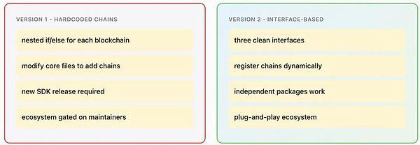 v1版本的SDK将区块链特定的逻辑嵌入到嵌套的 if/else 链中。添加新的区块链需要修改核心文件并发布新的SDK版本。v2版本引入了三个接口,实现了即插即用的区块链支持。