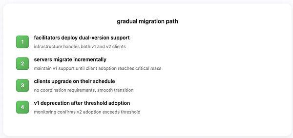 v2版本通过命名空间隔离保持向后兼容性。facilitator和服务器可以同时支持这两个版本。客户端通过 x402Version 字段指定版本偏好,实现会响应匹配的协议版本。