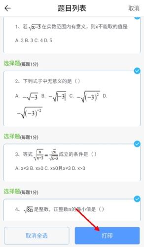 2、在这里用户可以自由选择想要打印的题目,选择完成后点击打印即可,打印需要提前连接好打印设备哦。