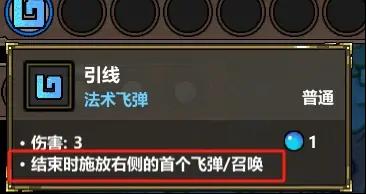 结束时释放右侧首个飞弹/召唤,顾名思义,如果我们将法术以下图方式排列,那么释放顺序将不会是发出引线,然后放出克总之心。而是直接耗蓝51(引线的1+克总之心的50)先发射引线,引线在结束后,会在结束位置释放克总之心。
