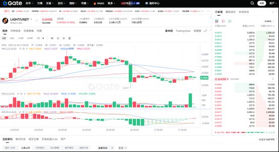 据GATE交易所数据显示,截至2026年1月4日,LIGHT币的最新价格约为0.6496美元,24小时内的最高价为0.6861美元,最低价为0.6128美元,24小时成交量为1137.11万LIGHT,成交额为730.23万美元。