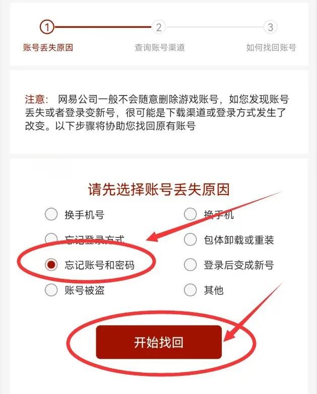 1、打开游戏在登录界面点击【账号找回】;2、选择【账号丢失原因】,再点击【开始找回】;3、依次输入【昵称或ID、服务器、角色】等信息,点击【查询】;4、查询到具体信息后,再点击【下一步】并按提示操作。