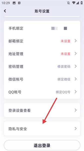 3、在账号设置页面,点击【隐私与安全】。