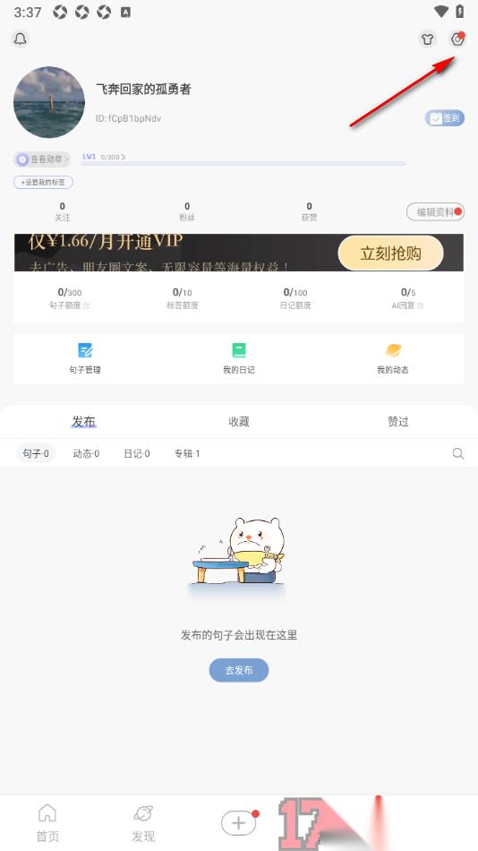 1.在手机上找到句子控app这款软件点击打开,在打开的首页面上将底部显示的我的选项点击打开即可进入。