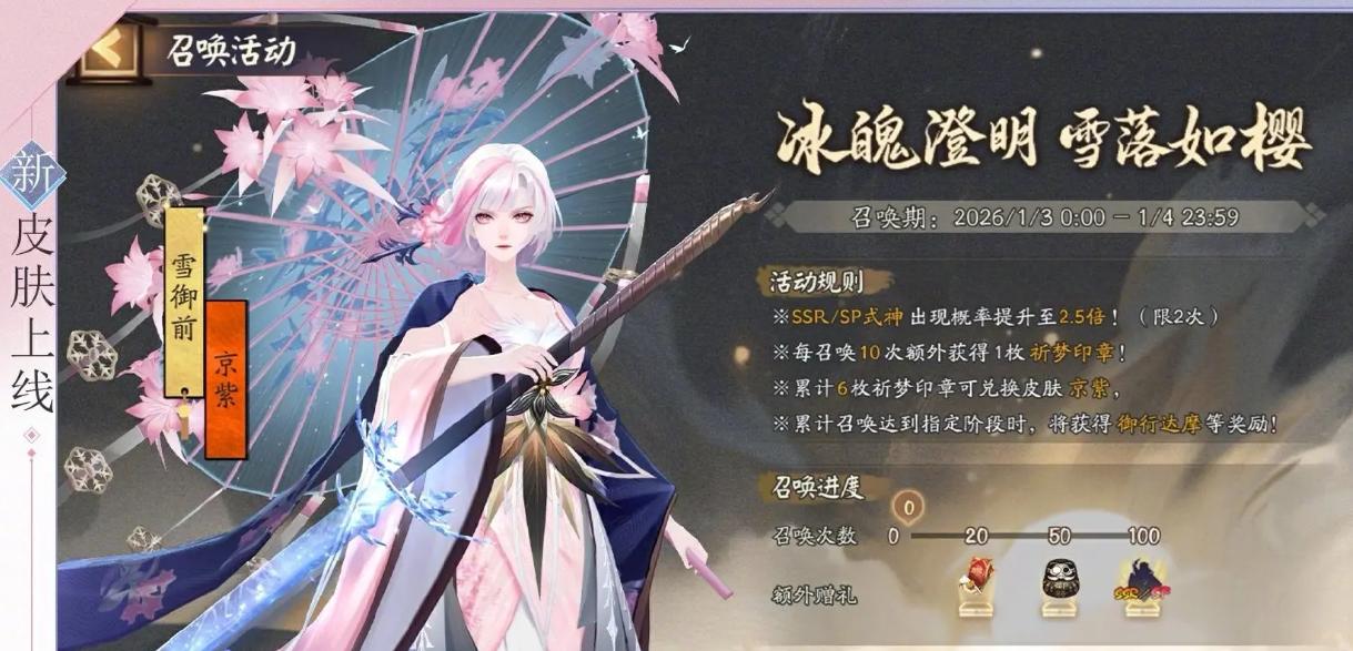 「冰魄澄明·雪落如樱」特别召唤活动将于2026年1月3日0:00-2026年1月4日23:59开启,大人可享受2次SSR/SP式神概率UP机会!