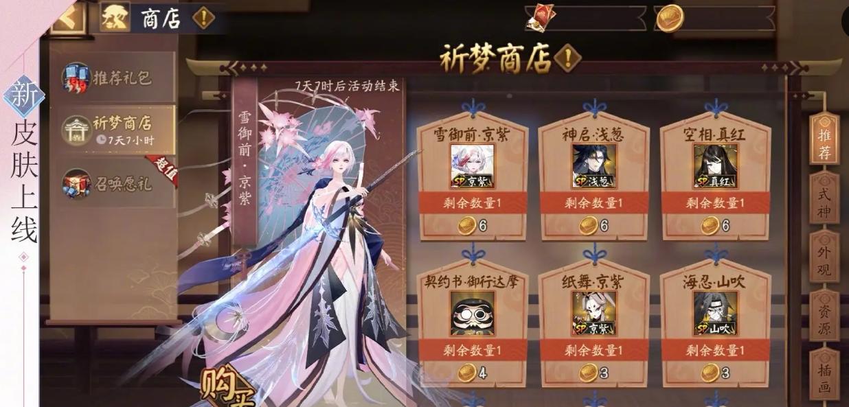 累计召唤达到指定次数,即可获得「祈梦印章」、祈梦插画券、御行达摩、随机SSR/SP式神等奖励。消耗「祈梦印章」可在祈梦商店兑换雪御前皮肤「雪御前·京紫」及返场染色皮肤等好礼!