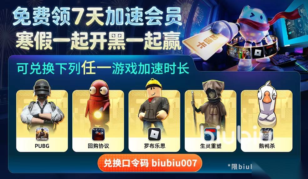 在各种加速工具当中,biubiu加速器凭借优异的性能和简便的操作模式脱颖而出,这款产品具备“一键畅连”功能,用户无需复杂设置就能迅速接入想要的网络环境,而且支持Steam,PlayStation,Xbox,Nintendo Switch,PC这些主流平台,用户只需搜索“罗布乐思”或选择对应平台服务,然后点击“加速”,系统就会自动匹配最合适的节点达成高效连接。另有限时活动,从2月10号到3月9号这段时间,输入【biubiu007】专属口令,可任选指定5款游戏(PUBG、回购协议(R.E.P.O.)、罗布乐思、生灵重塑、鹅鸭杀)中的任意一款,获得专属7天加速时长。