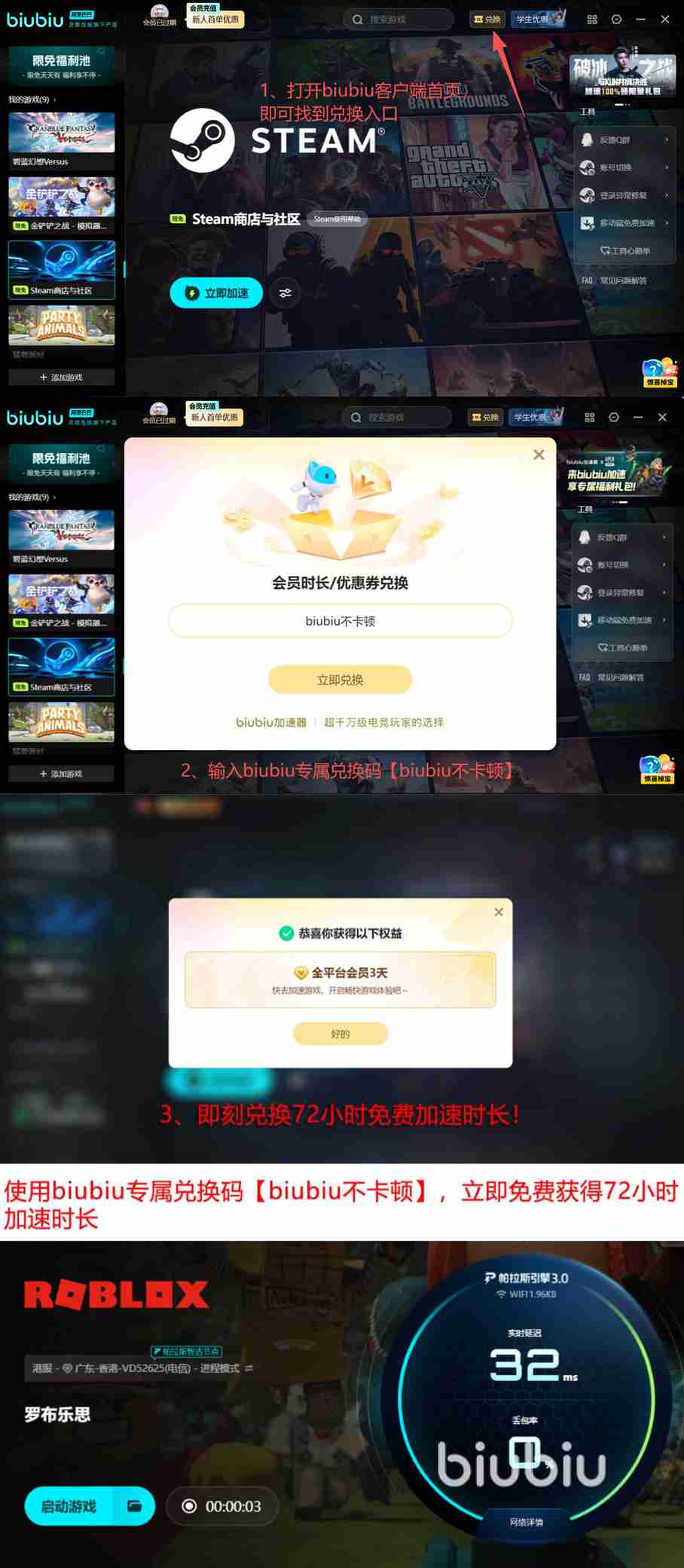 biubiu加速器搭载帕拉斯引擎3.0技术平台,结合智能链路优化算法达成性能突破,品牌特聘PUBG冠军选手左梓轩担任体验官,其专业网络调优经验被深度整合到产品开发阶段,为普通用户营造低延迟,高稳定的游戏运行环境—这种设计有效解决罗布乐思的延迟难题。新用户首次注册就能得到24小时全平台无门槛免费加速,输入【biubiu不卡顿】兑换,可获得72小时全平台游戏加速时长(适用所有支持的游戏)。两个兑换码每位用户限选其一使用。若选择【biubiu007】,则仅限兑换指定5款游戏中一款的7天加速;若选择【biubiu不卡顿】,则获得全平台72小时加速。