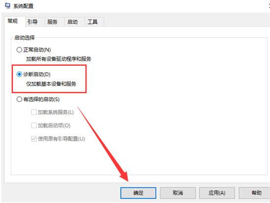 10、打开系统配置窗口,勾选“诊断启动”,点击“确定”,重启电脑即可修复Win10无法进入系统的问题,如下图所示。