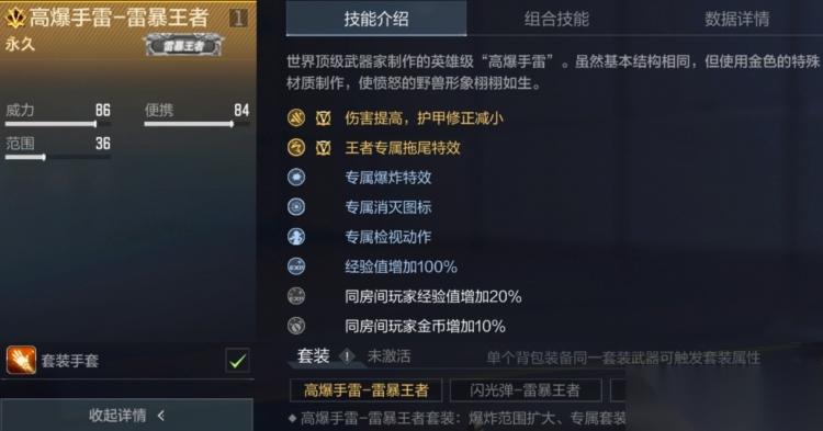 高爆手雷-雷暴王者基础伤害高达198点,护甲系数低至0.518,命中有甲敌人伤害为83点,与常规王者手雷持平,无甲状态下可直接秒杀,其手感偏重,落地后瞬间爆炸,爆炸时迸发金色电光特效,无震屏反馈,对自身视野影响较小。
