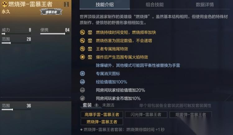 燃烧弹-雷暴王者主打固定高伤机制,区别于普通燃烧弹的伤害递增模式,全程保持固定伤害,同时燃烧频率加快、持续时间略短,拥有王者专属投掷拖尾,搭配雷暴投掷套装可延长1秒燃烧时间,弥补持续伤害时长短板,实战中能快速消耗敌人血量。