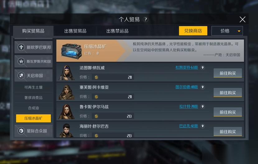 贸易玩法是游戏中相对轻度的玩法,它们不需要玩家亲自驾驶舰船投入战斗。贸易主要分为个人贸易与军团贸易两个部分,个人贸易允许玩家将持有的普通联储币转化为可以购买特殊物资的物联币,且因为贸易本身存在利润,实际转化完成时玩家投入的货币会实现增值。个人贸易的核心策略在于制定合理的贸易路线,以尽量短的运输跳数去追求更高的利润。游戏为此设立了简洁明了的价格看板,玩家可以查询所有贸易品当前的买入和卖出价格,其中卖出价格会根据其他玩家的贸易行为实时发生波动,例如短时间内大量玩家出售同一种商品给同一个商人会导致其出价暴跌。