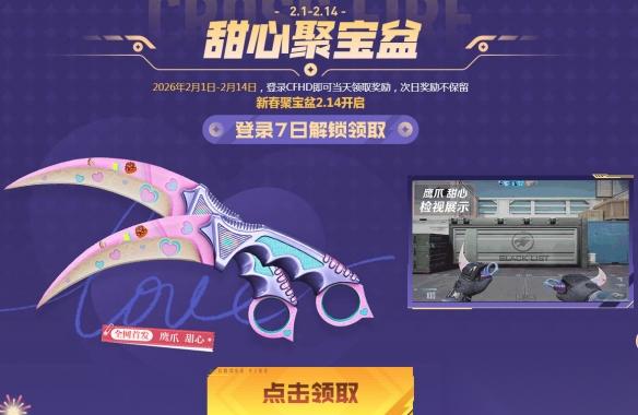 2月1日-14日,甜心聚宝盆活动限时开启,每日登录CFHD即可当天领取奖励,次日奖励不保留,登录1日即可领取M4A1 PINK,登录2日可领取全新挂饰-情人节,登录7日更能解锁全新首发的鹰爪 甜心。