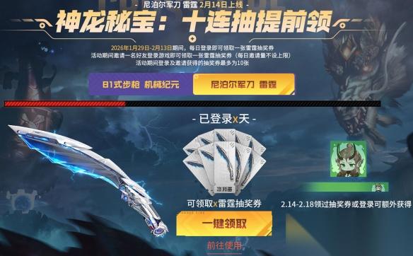 尼泊尔军刀 雷霆将于2月14日登录神龙秘宝,1月29日-2月13日期间,CFer每日登录都可领取雷霆抽奖券,最多可领10张。