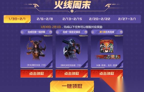 从1月30日至3月1日,每个周末CFer都可完成对应任务领取道具奖励,每周任务完成还有额外奖励可以领取。