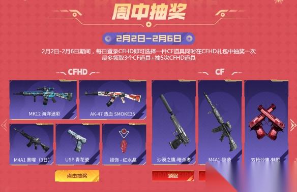 此外,整个2月周中每日登录游戏还有好礼相送。例如2月2日-6日期间,CFer每日登录CFHD即可选择一件CF道具,同时在CFHD礼包中可抽奖一次,最多可领3个CF道具+抽取5次CFHD道具,MK12 海洋迷彩、AK-47 热血 SMOKE35等道具轻松带回家。