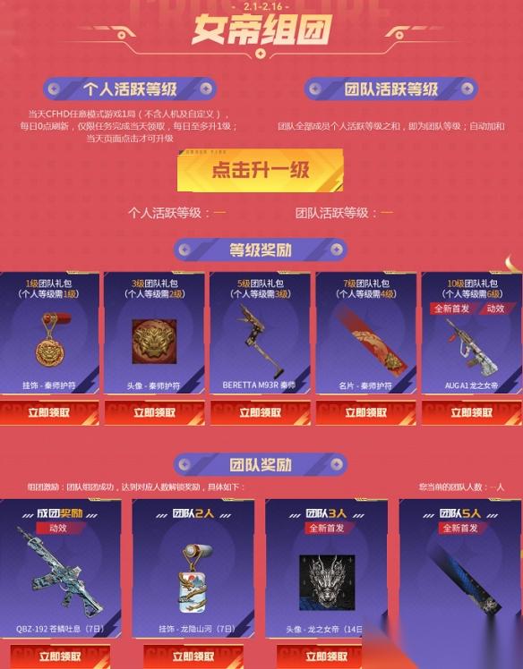 2月1日至16日,女帝组团活动上线,CFer登录游戏并进行对局即可提升个人及团队活跃等级,不仅有机会获得全新首发的AUG A1 龙之女帝、头像 龙之女帝以及名片 龙之女帝,还能带走QBZ-192 苍鳞吐息(7日)、BERETTA M93R 秦师等海量道具。