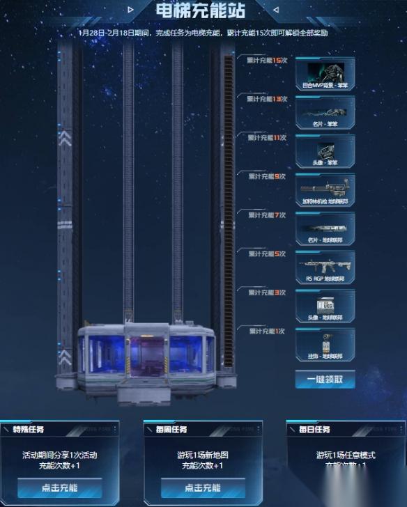 2月18日前参与电梯充能站活动,完成任务即可解锁至多8款道具。