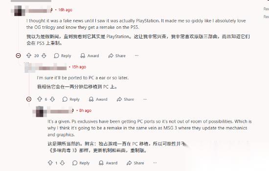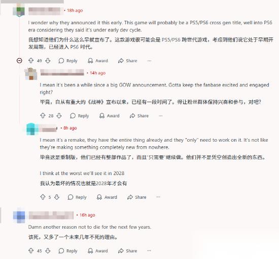 与此同时,玩家们也对重制版的开发与发售展开了讨论。有网友疑惑 “为什么这么早就公布,游戏还处于早期开发阶段,可能会是 PS5/PS6 跨世代作品”,也有人认为 “距离上次《战神》大新闻已经很久了,需要保持粉丝的兴奋度”,还有人推测 “既然是重制版,核心内容已经存在,开发难度低于全新作品,最晚可能在 2028 年推出”。不少玩家直言 “又多了一个活下去的理由”,还有人表示 “一开始以为是假新闻,确认是 PlayStation 官方消息后,激动得不行,太爱初代三部曲了”。
