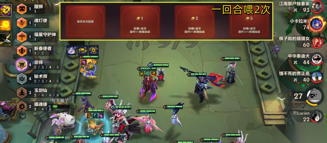 怎么喂大嘴?目前大嘴都认为有BUG,每回合能喂两次,怎么喂一图这里就不细教了,免得招来非议!就算这不是BUG,一回合喂10金币经济也挺伤的,所以符文强化最好能三经济,两经济+一续航类强化也凑合,这样大嘴可以带无尽+羊刀+水银,提高一星大嘴在拉9之前的输出+锁血能力。宗秘大嘴8级阵容的基础构筑:核心:大嘴;秘术师:锤石、慎、悠米、风女、妮蔻;宗师:永恩、慎、刀妹;其它:任意新春卡。