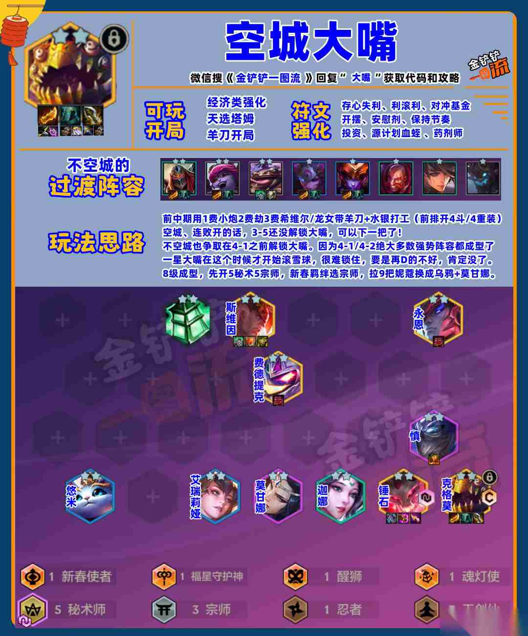 8级成型,先开5秘术5宗师,新春羁绊选宗师,拉9后再把妮蔻换成乌鸦+莫甘娜,秘术天选,就不要妮蔻。最后,空城宗秘大嘴一图流奉上: