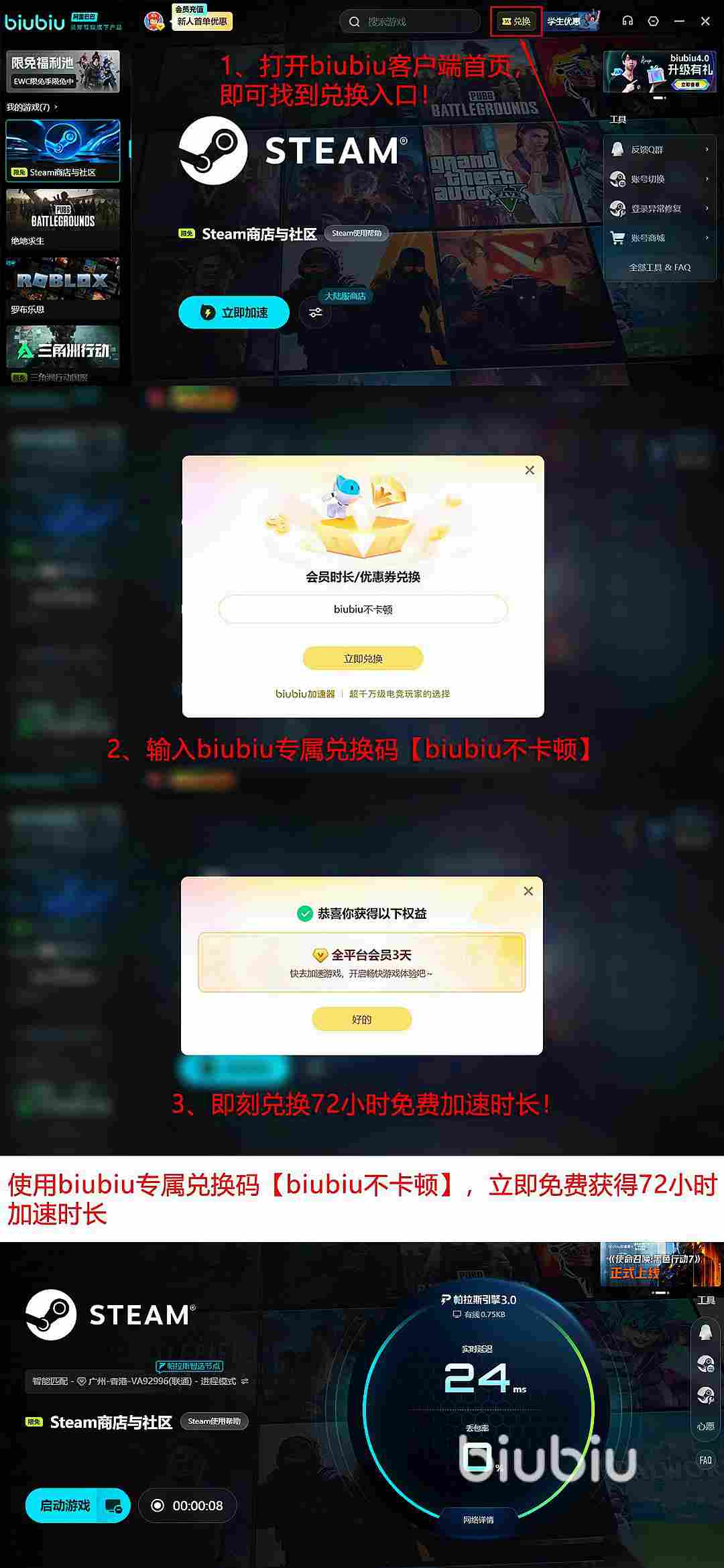 同时福利这方面也是给到位的,只要是新用户注册就可以免费加速24小时,全体用户使用兑换码【biubiu不卡顿】可以额外获得3天的免费加速,其中新用户最高可叠加96小时免费时长,全网畅玩无压力。