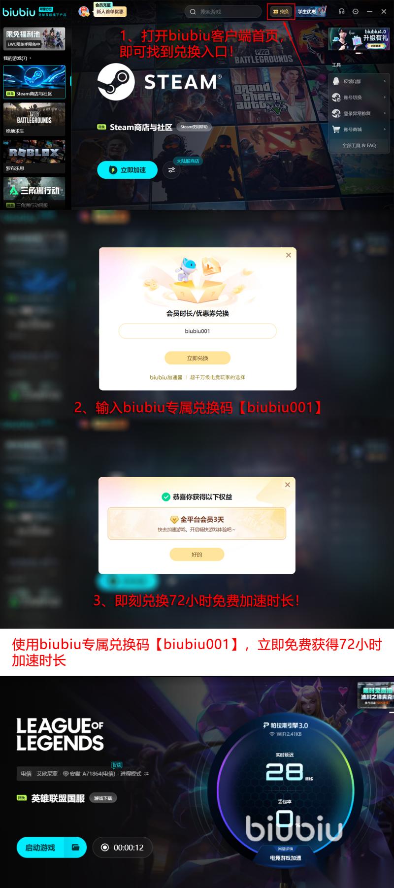 biubiu加速器的表现还是很不错的,毕竟这可是PUBG冠军选手 XDD(小叮当)所指定的一款加速器,那在实力这一方面就无需过于的担心。先来说一下这款加速器有什么特色?有帕拉斯3.0引擎,还有阿里巴巴灵犀互娱技术。可以精准的识别英雄联盟在运行时的数据,如果出现卡顿就会马上切换,从根源上改善掉帧问题。biubiu加速器还给所有的人准备了丰富的免费福利,例如新用户在首次注册之后就有24小时免费礼包。但这并不是最终的福利,还可以通过【biubiu001】兑换长达3天的免费礼包。那这样就可以享受96小时的免费体验,可以尽情的享受职业级别的网络保障。