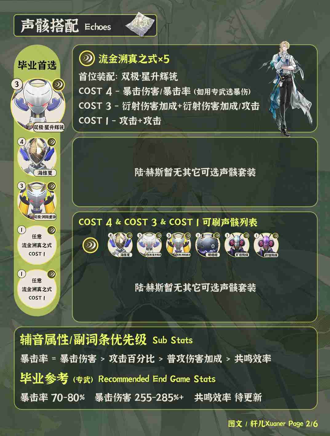 ② 陆·赫斯声骸套装推荐优先流金溯真之式五件套。注意首位需要装配COST3双极·星升辉铳,提供衍射和普攻伤害加成。另外一个COST3完美搭配需要使用另一个双极·渊陨重锋。如果你觉得手感差或者不差这点伤害,可以换别的COST3来刷。