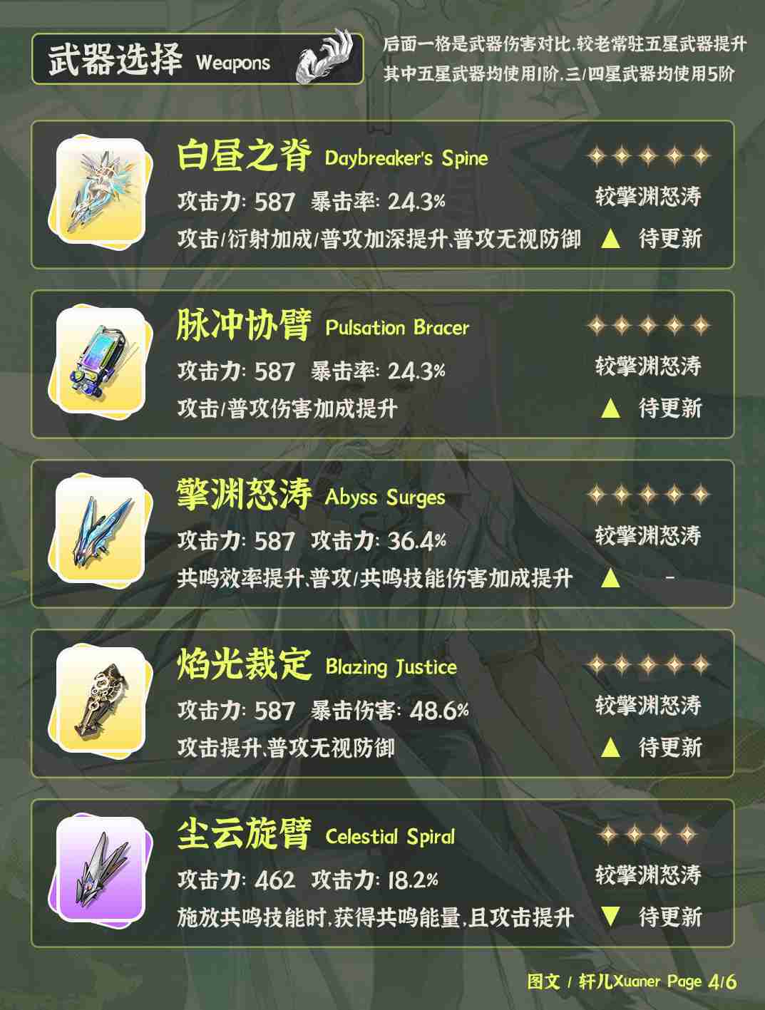 ④ 陆·赫斯武器首选专武白昼之脊。其次新常驻五星也是非常适配陆·赫斯,如果资源紧张可以先用着。老常驻五星和赞妮专武同样可以提供部分普攻收益。其余五星专武暂不推荐。四星武器的话可以考虑尘云旋臂。