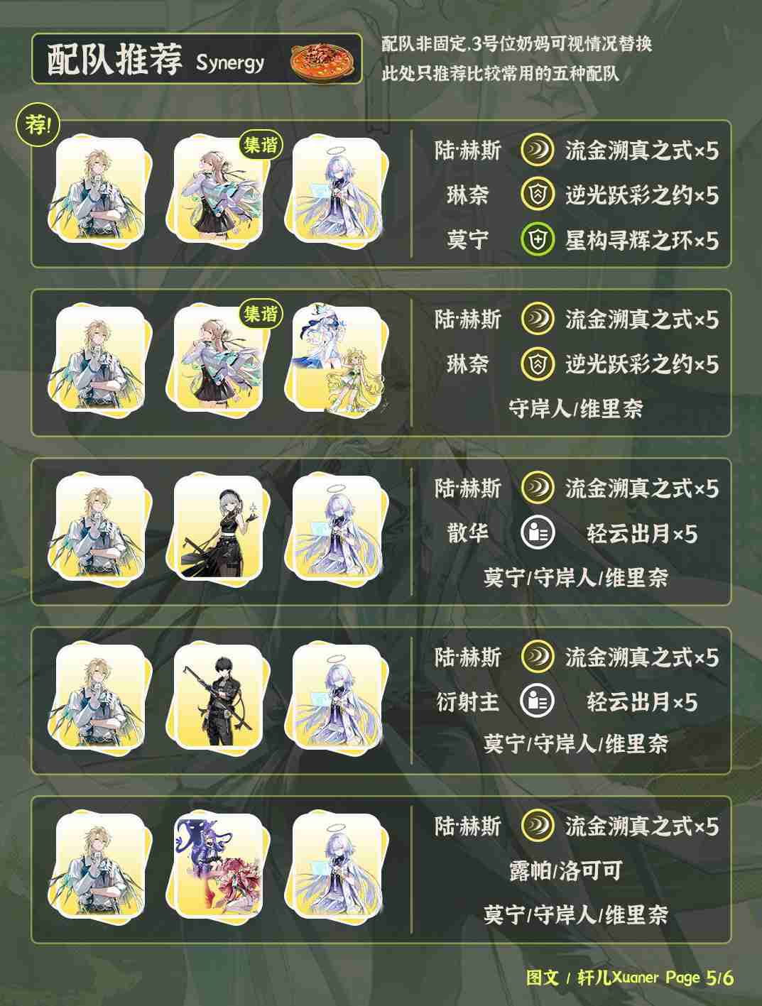 ⑤ 陆·赫斯是集谐普攻主C。最佳搭配是琳奈和莫宁,其中莫宁也可以换成其它奶妈。如果没有琳奈,可以考虑搭配散华/露帕/洛可可这种普攻加深副C。或者衍射主6链提供衍射减抗。配队比较亲民。