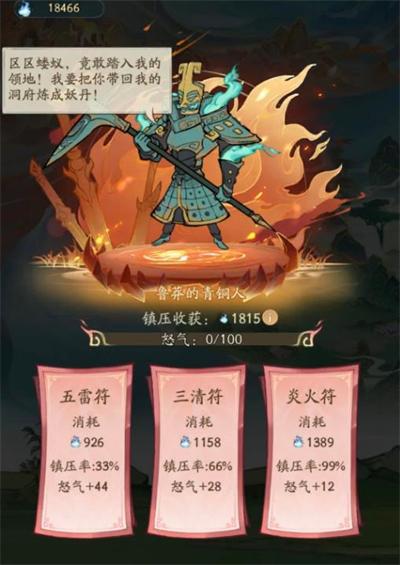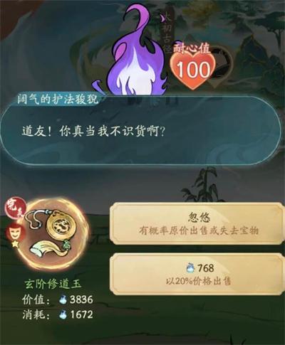 3、镇压/破禁/强卖法宝类事件,镇压妖兽、破禁:全部选111(最低成功率),故意失败,避免拿到低阶法宝占背包,影响卖货;若背包为空,可适当拿1个。强卖法宝、阵法类:全部点最左边选项,不要法宝,避免占用背包空间。