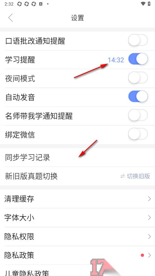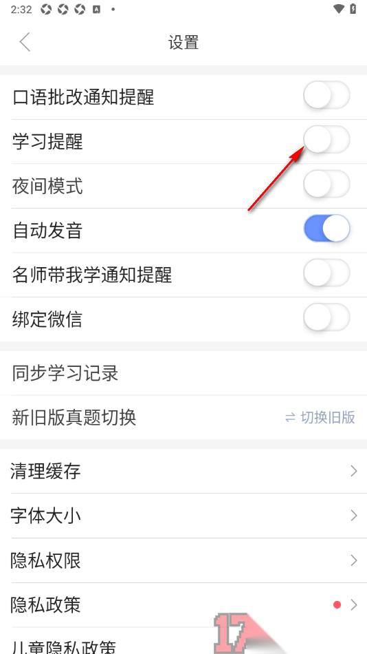 5.除此之外用户可以在该设置页面中设置夜间模式、自动发音、同步学习记录以及切换新旧版真题等内容。