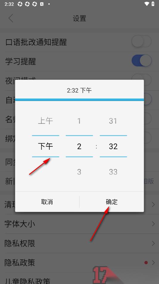 4.这时候页面上会弹出一个设置学习提醒的时间窗口,在该窗口中需要选择自己想要设置的时间,然后点击【确定】按钮即可保存。