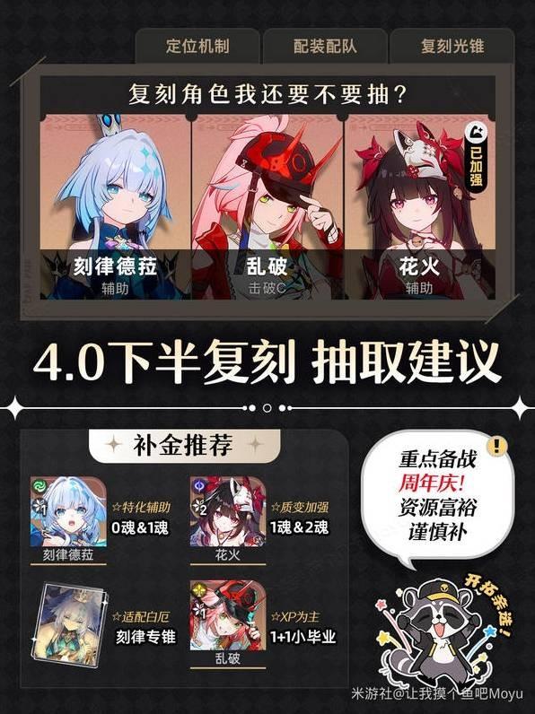 在《崩坏:星穹铁道》4.0下半版本中,游戏复刻了刻律德菈、乱破、花火三名角色。很多玩家关心这些角色的培养方向和抽取建议。整理了崩坏星穹铁道4.0下半复刻角色抽取建议指南,希望能够帮助到各位。