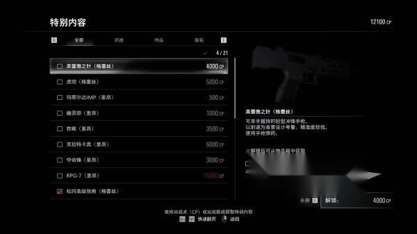 推荐优先将CP点数用于战斗难度较高的格蕾丝篇,例如兑换【无限耐久小刀-虎彻】或前期比较好用的【芙蕾雅之针】,以及能大幅降低攻略难度的【无限弹药(枪械)】和【无限弹药(RPG-7)】。【无限耐久斧头】的性价比不是很高,如果CP点数不是很充裕的话,不推荐优先解锁。