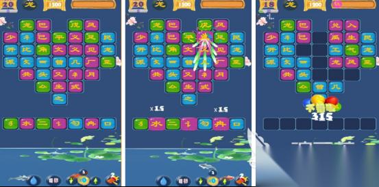 与市面上的文字类游戏完全不同,在随机生成的汉字网格当中,通过点击或者划线的方式选择组合的偏旁或者部首,完成汉字或词语消除,不同汉字在颜色方面是有所差异的,最终形成极高的辨识度,整体的规格较为简单,设计富有深度。