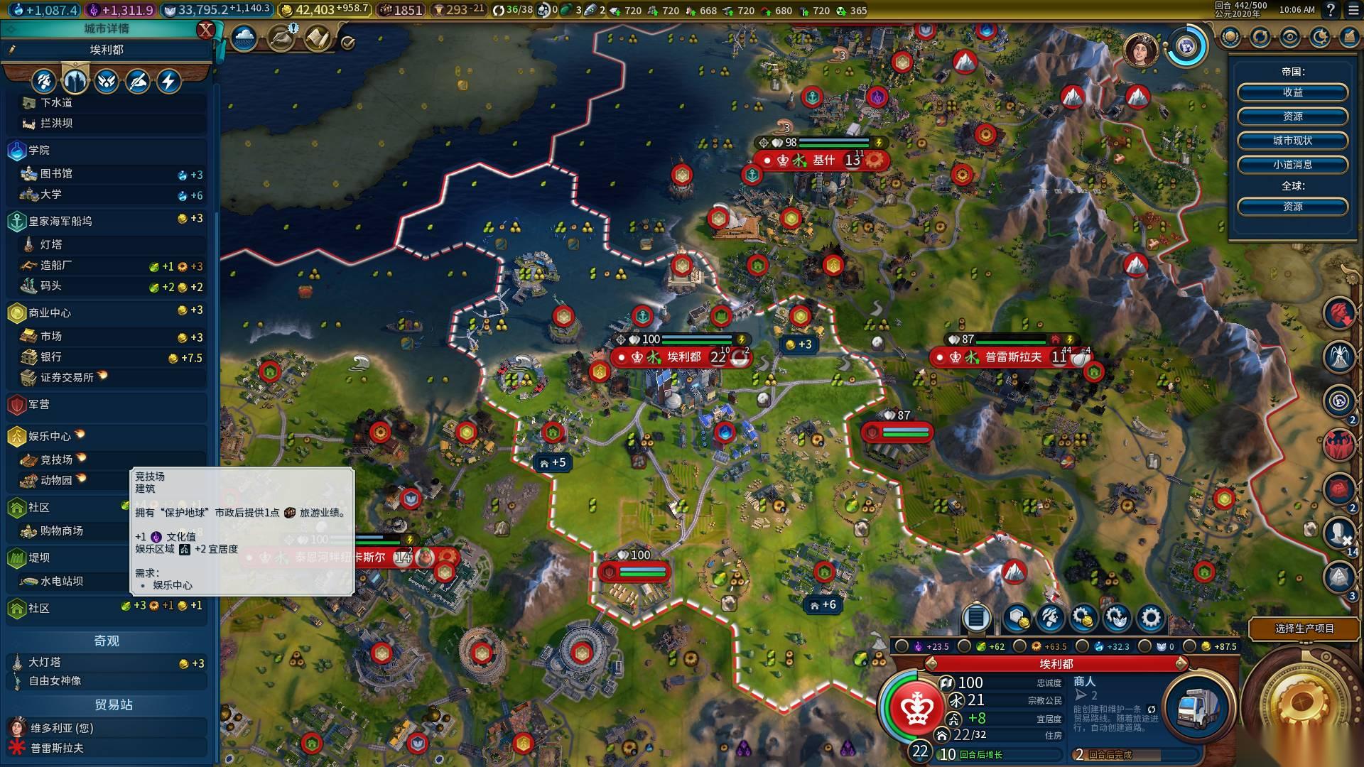 建造娱乐中心区域及其附属建筑如竞技场、动物园能直接提升本地宜居度,而水上乐园的区域效果可辐射邻近城市。部分奇观如罗马斗兽场或马拉卡纳体育场提供大范围加成,但修建时需评估城市产能和战略优先级。工业区与娱乐区的平衡至关重要,前者会削减宜居度而后者能补偿,建议在工业密集区配套建设娱乐设施。