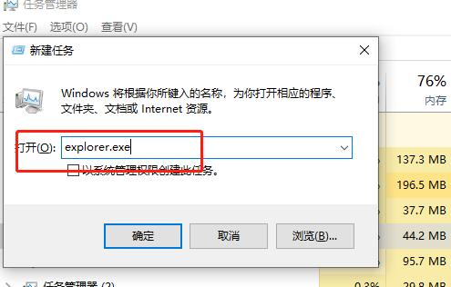 5、然后再次打开运行,输入”explorer.exe“,重新启动Windows资源管理器即可,如下图所示。